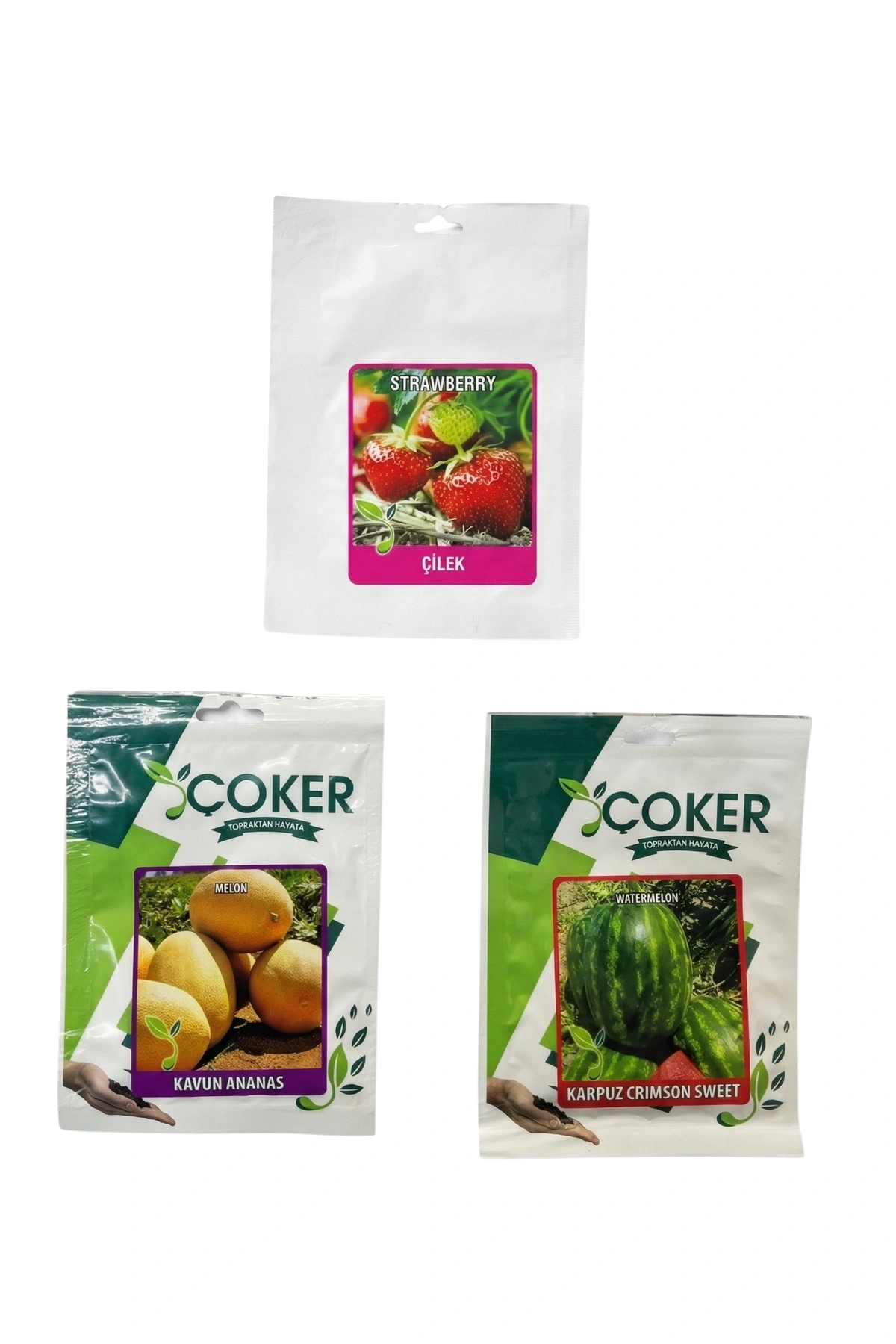 Paket İçeriği: 1 Adet Kavun Ananas, 1 Adet Karpuz Crimson Sweet ve 1 Adet Çilek Tohum Paketi.