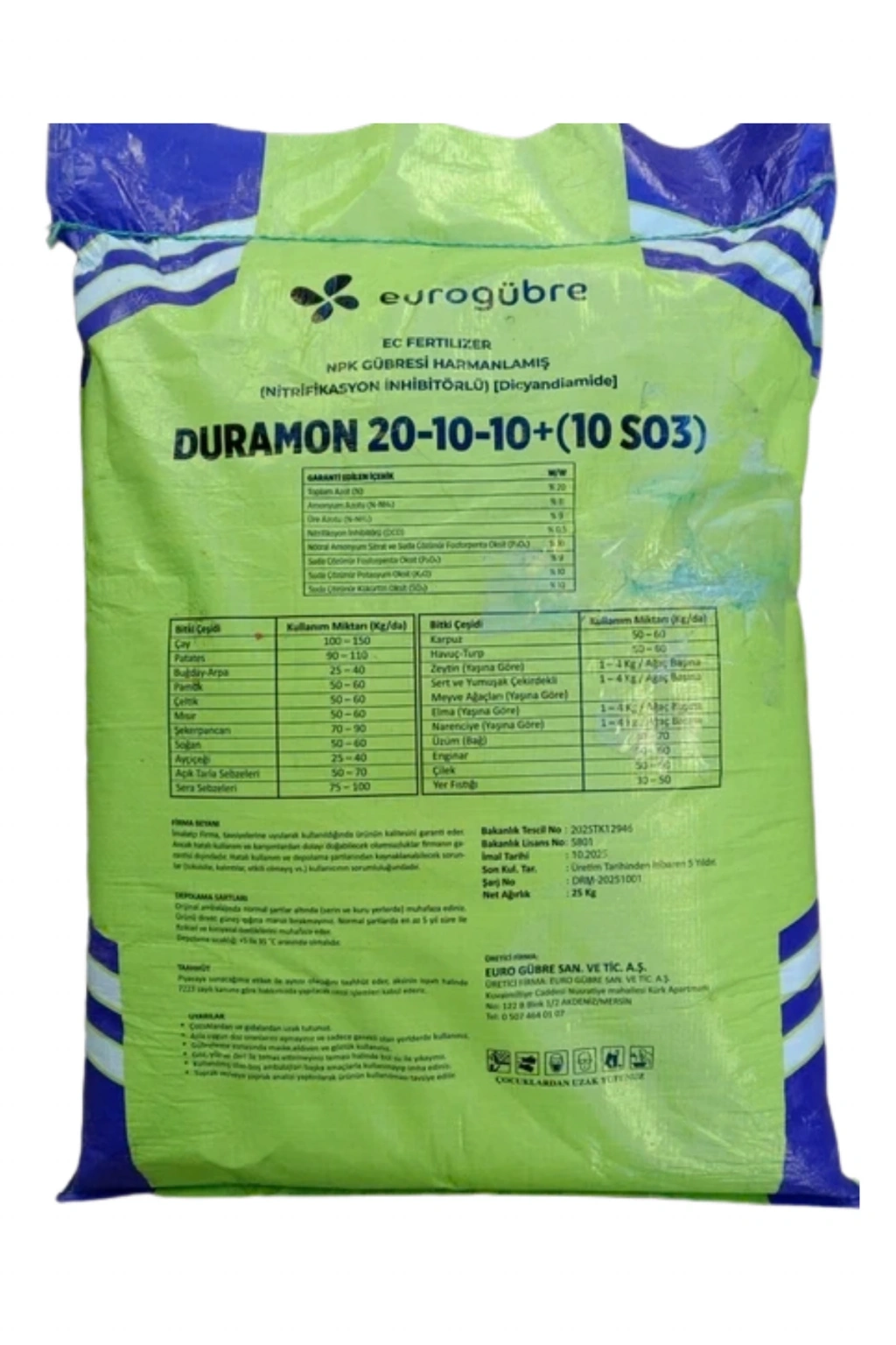 Duramon 20-10-10 + (10 SO3) NPK 25 Kg İnhibitörlü Akıllı Yeşil Gübre
