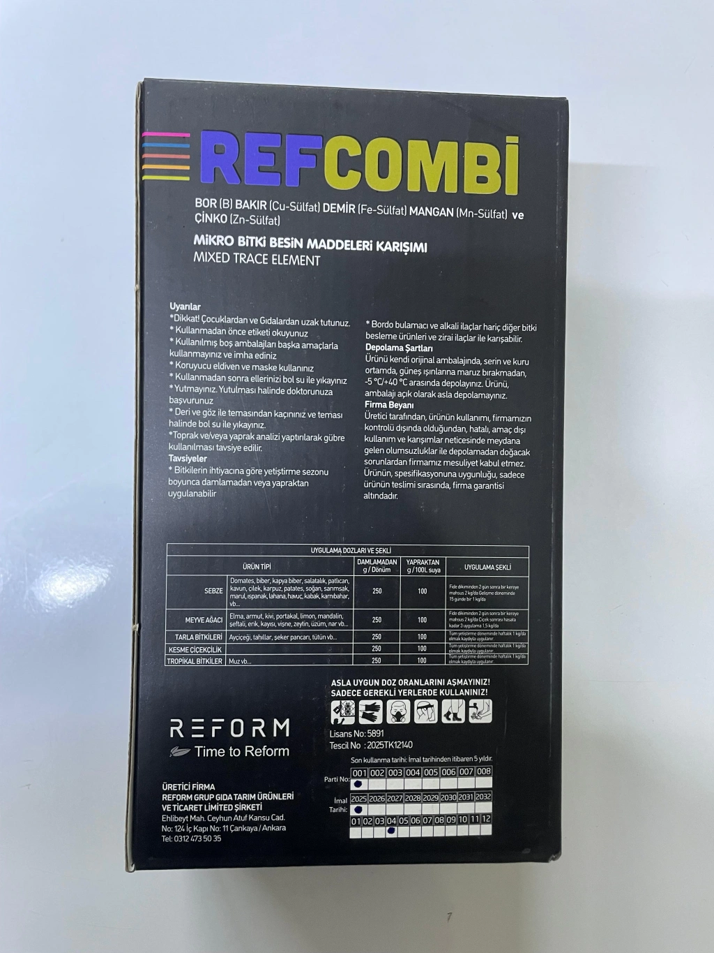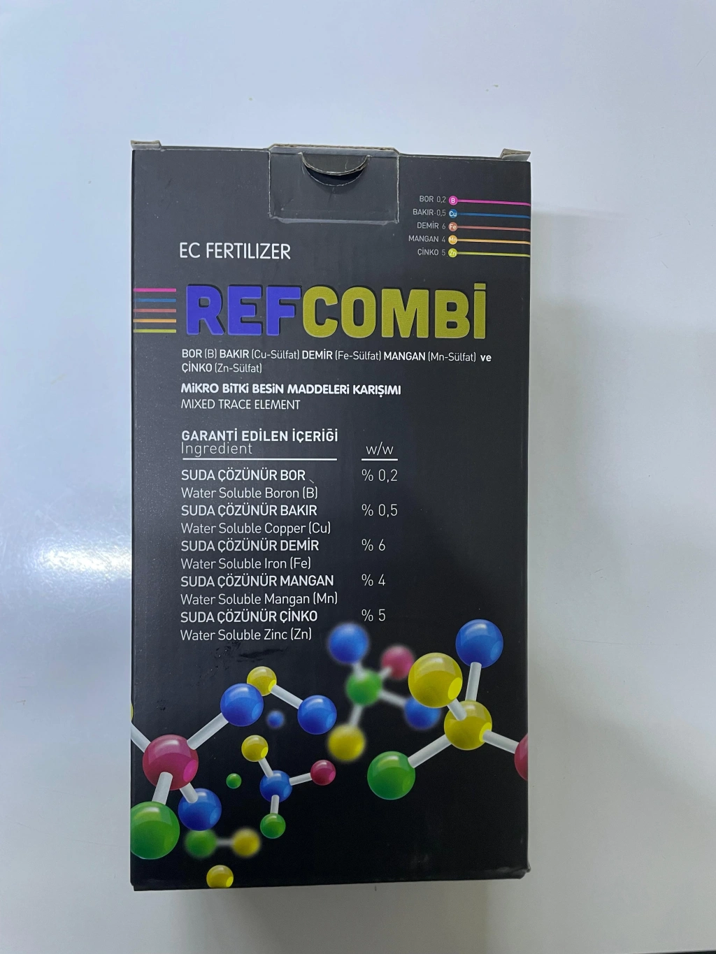 REFCOMBİ 1 KG Yaprak Gübresi; Bor (B),Bakır (Cu),Demir (Fe),Mangan (Mn) ve Çinko (Zn) gibi temel mikro besin elementlerini dengeli şekilde içerir.