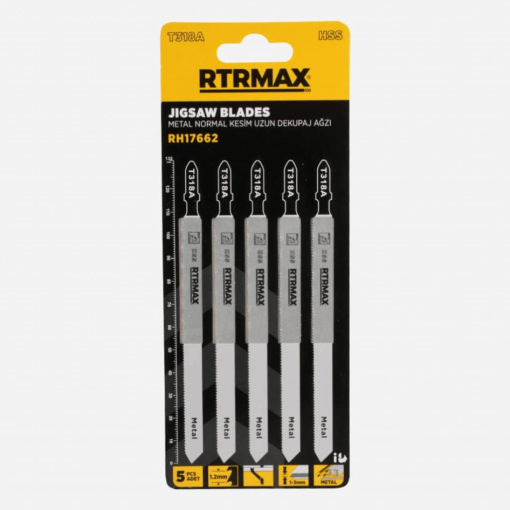 RTRMAX T318A uzun dekupaj testere uçları, 132 mm uzunluğunda HSS malzemeden üretilmiş olup, 1-3 mm kalınlığındaki alüminyum ve metal borular gibi malzemelerde hızlı ve düzgün kesimler yapmanızı sağlayan, frezelenmiş dalga setli dişleri ve yüksek performansı ile metal işçiliği projelerinde uzmanlık ve kalite sunan dayanıklı ve verimli bir çözümdür.