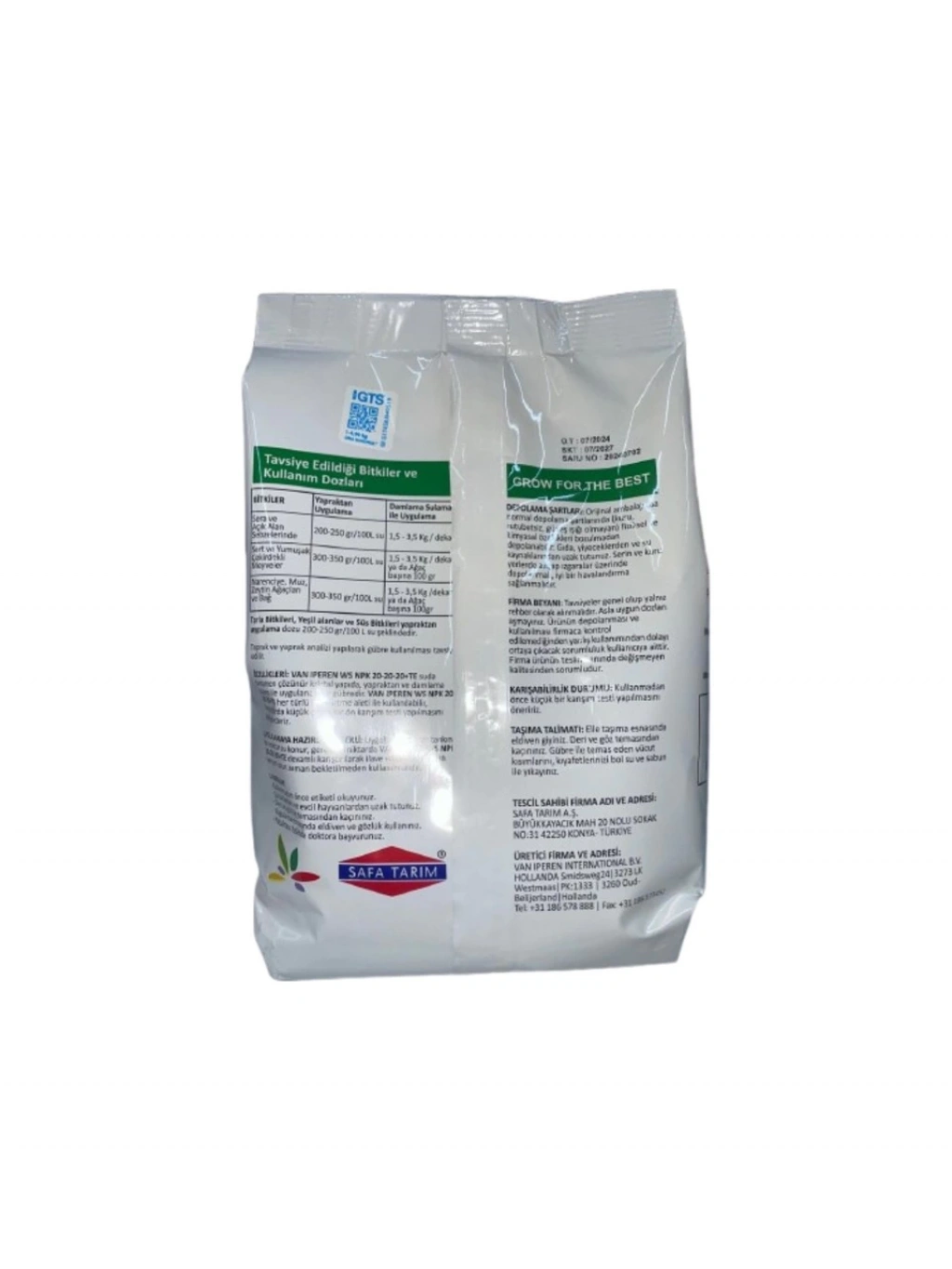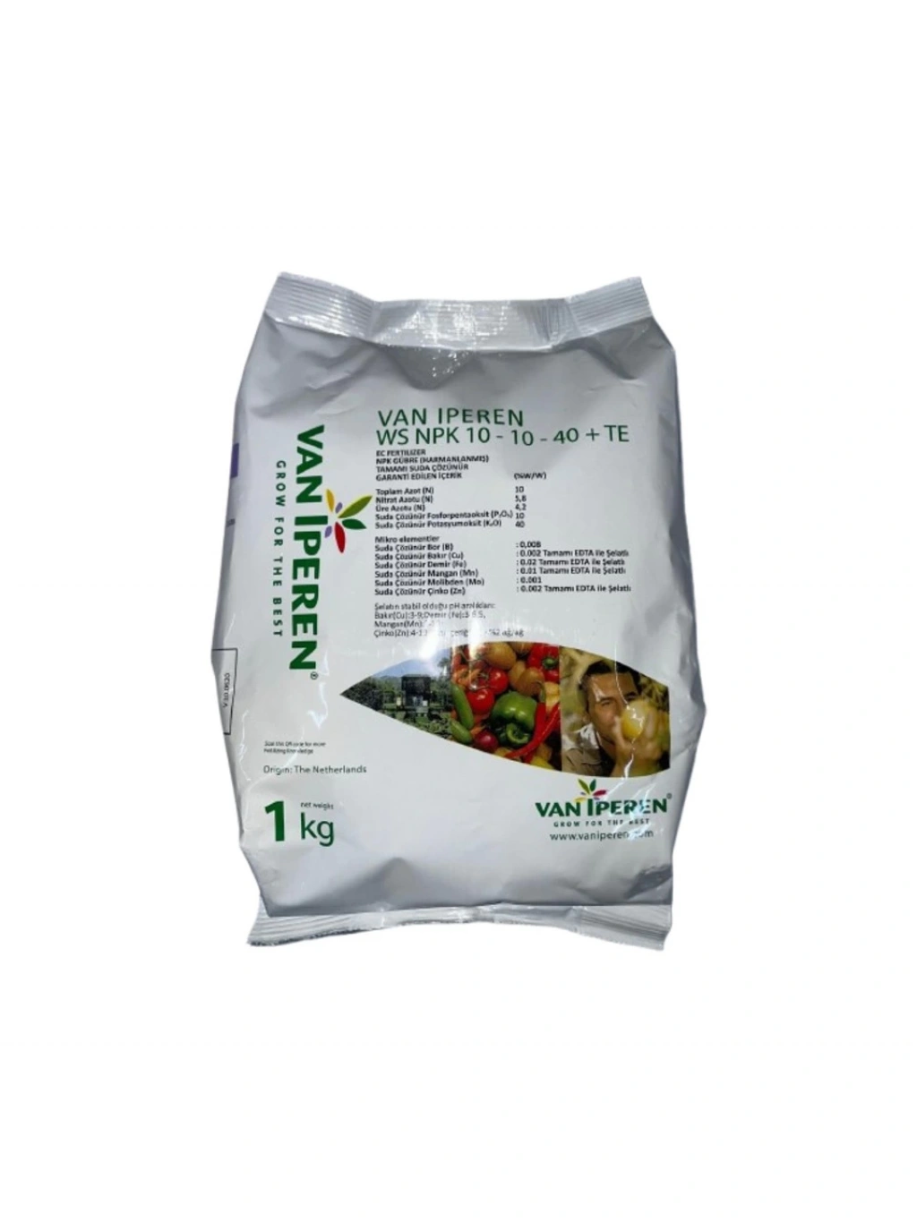 Van Iperen ws npk 10-10-40+te suda tamamen çözünür kristal yapıda, yapraktan ve damlama sulama ile uygulanan bir gübredir.
