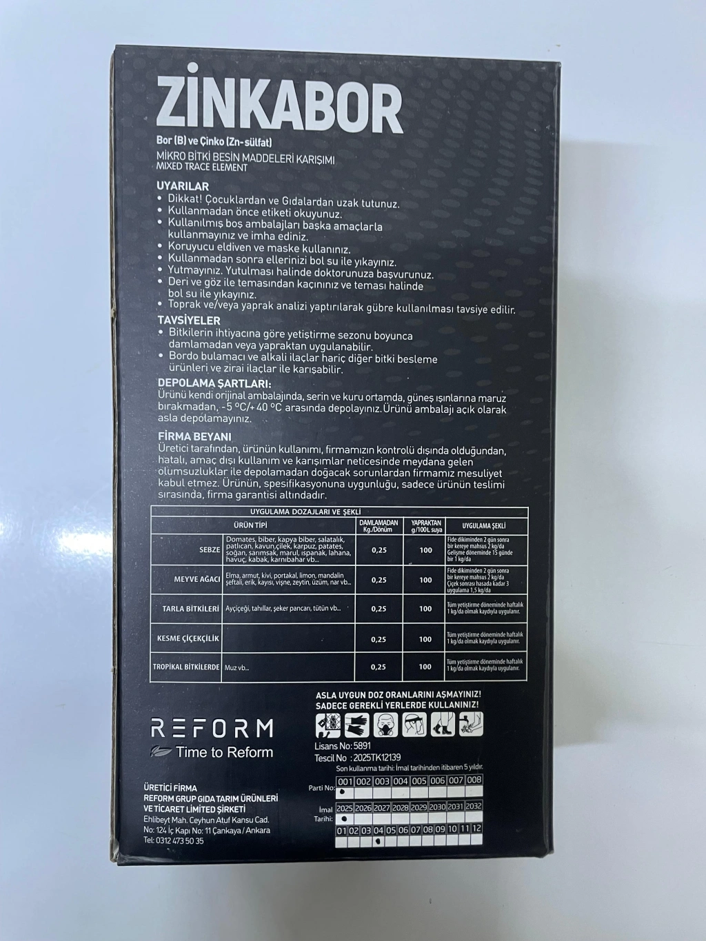 ZİNKABOR 1 KG Yaprak Gübresi, bitkilerin özellikle bor ve çinko eksikliğine karşı geliştirilmiş özel bir mikro besin karışımıdır.